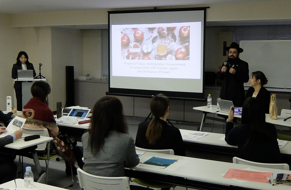 11月22日に浜松町(東京都港区)で行われた東京都の主催による、外国人旅行者受入セミナー第8回「外国人旅行者の様々な習慣・制限等への対応~コーシャ、オーガニック」にて、イスラエル大使館さんと共同で、弊社のラビ・ビンヨミン・Y・エデリーがコーシャについて講演させていただきました(弊社コーシャ・コーディネーター青木がサポート)。