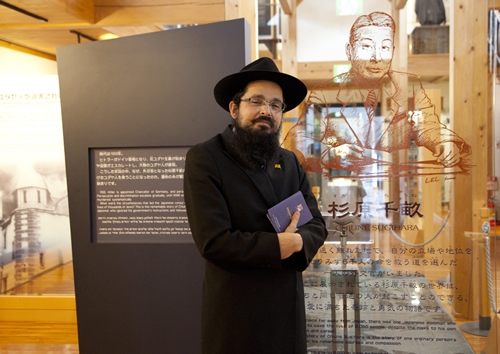 ↑杉原千畝の生まれ故郷である、飛騨高山から近い岐阜県加茂郡八百津町の杉原千畝記念館に立ち寄ったラビ・ビンヨミン。年間の訪問者数はイスラエル人だけで2000人にもおよび、肉親の命を助けた感謝の気持ちを伝えていく人々も多いといいます。