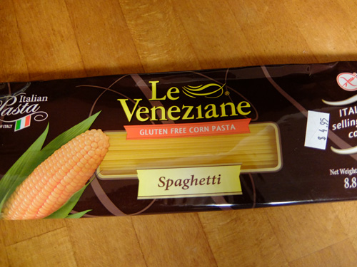 ↑こちらはとうもろこし粉100%のイタリア産グルテンフリー・パスタ。見た目は小麦粉のパスタと遜色ないが、食味に改善の余地あり。コーシャ認証マーク付き。
