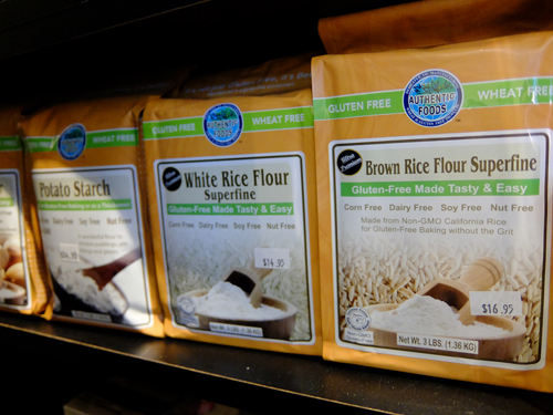 ↑アメリカで販売されているきめの細かいグルテンフリーの粉類。米粉のほか、米粉ととうもろこし粉を混ぜたものや、じゃがいものでんぷんなどさまざまな種類が販売されている。値段は高価。