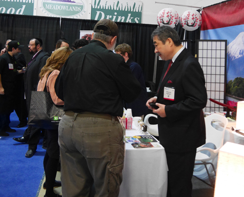 ブースは、外国人の方々にもわかりやすく、富士山やのれん、提灯、はっぴ、着物など日本を連想させるデコレーションや服装でお客様をお迎えしました。他のアメリカらしくショーアップされた華やかなブースの数々から見ると多少、地味かもしれませんが、”異色”という意味ではなかなか目立っていたのではないかと思います。