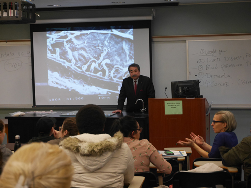 一方、アカデミックな場で日本食品の優れた点を発表すべく、秋田今野商店代表で農学博士の今野さんが、ニューヨーク市立大学ブルックリン校の栄養科学の授業にゲスト講師として招かれ、学生さんや教授たちに向けて日本の麹について英語による講義を行いました。